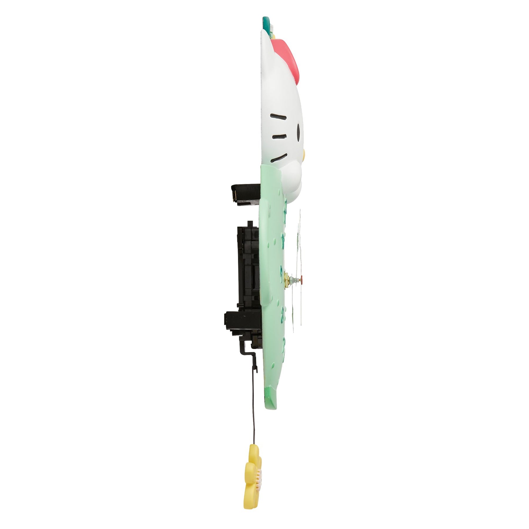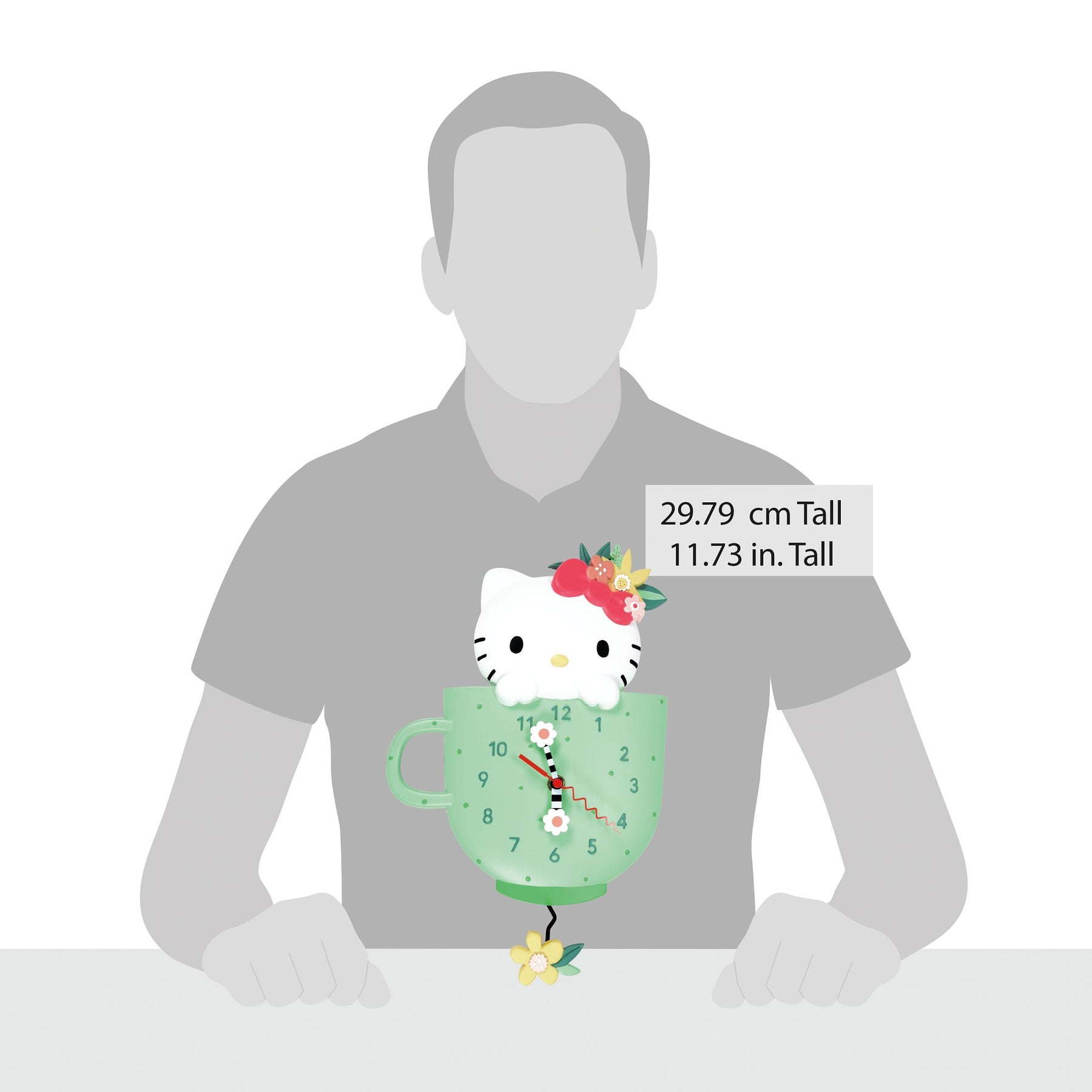 Keep time in Sanrio style with Hello Kitty! Peeking out of a green tea cup, Hello Kitty wears flowers tucked behind her iconic pink bow. This curious cat clock helps you plan your day with ticking flower hands and swinging pendulum.