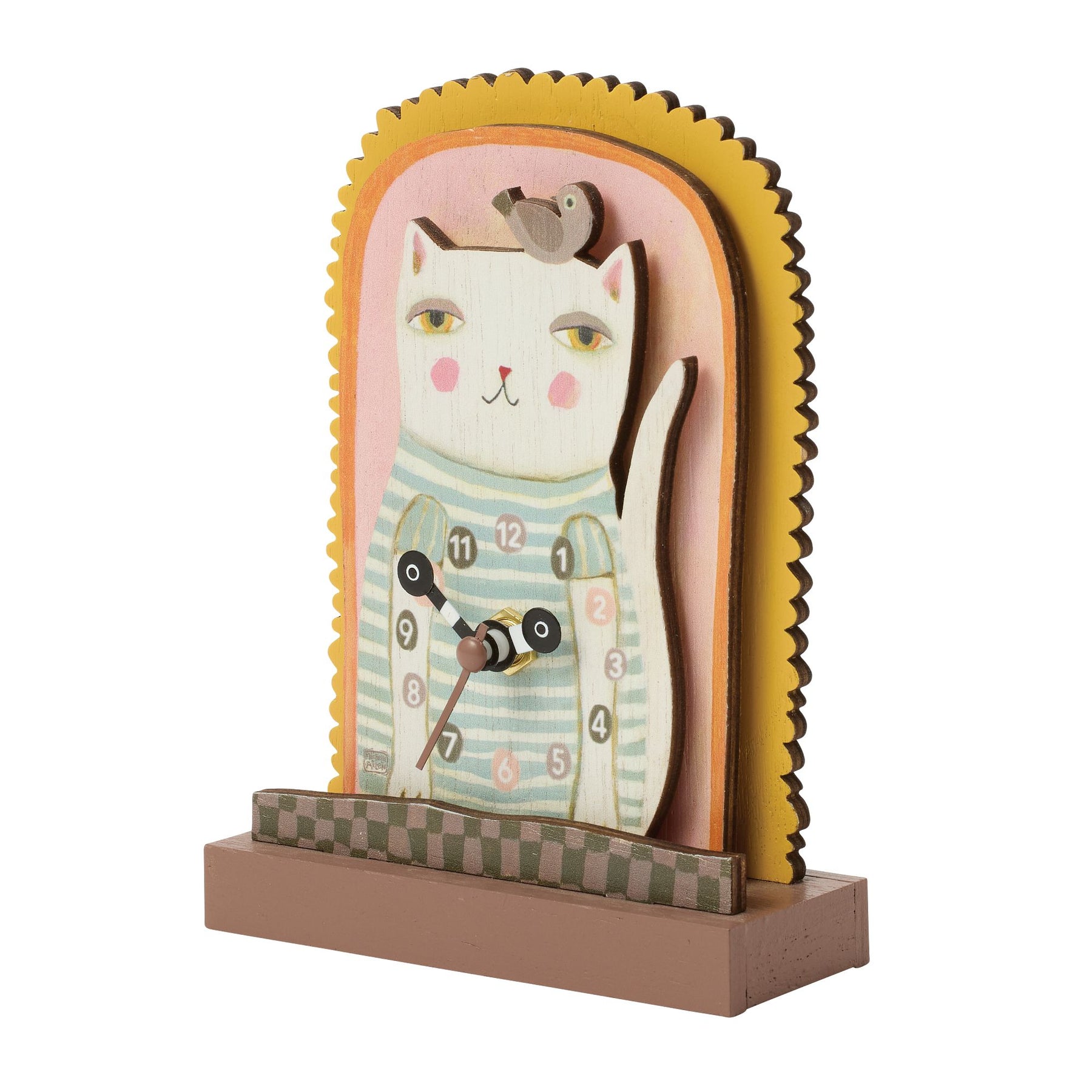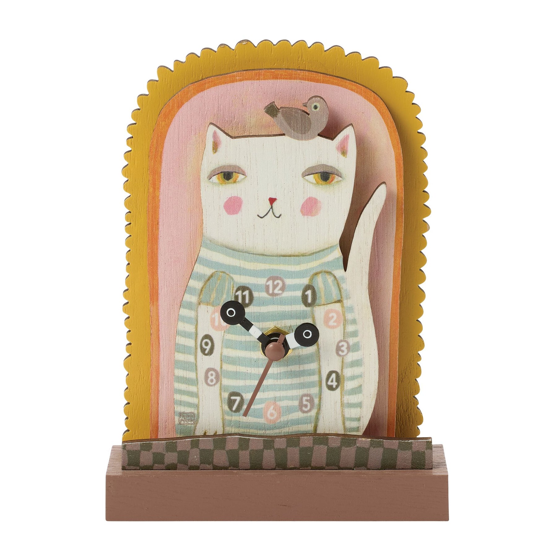 This curious cat from Allen Designs is clearly keeping one eye on the clock and the other on mischief. With expressive eyes and playful posture, he purrfectly keeps time. This wooden desk clock proves that time flies when you take multiple cat naps.