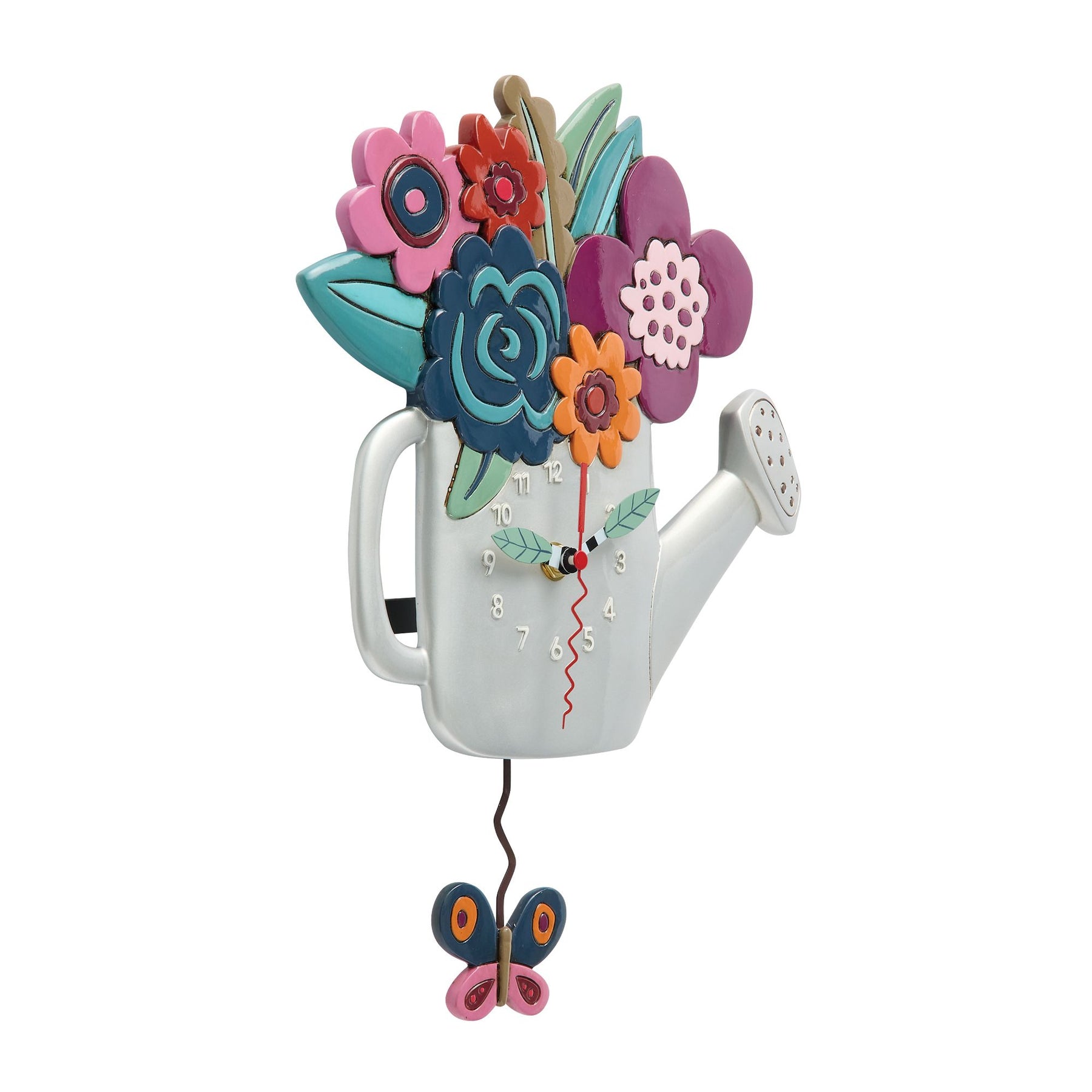Brimming with color and charm, this silver watering can clock by Allen Designs overflows with blooming flowers and joyful energy. Leaf-shaped hands mark the time, while a butterfly pendulum flutters below, reminding us to bloom where we're planted.
